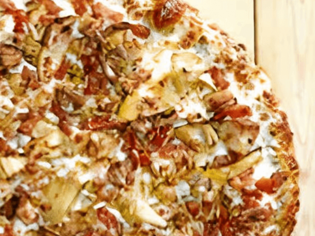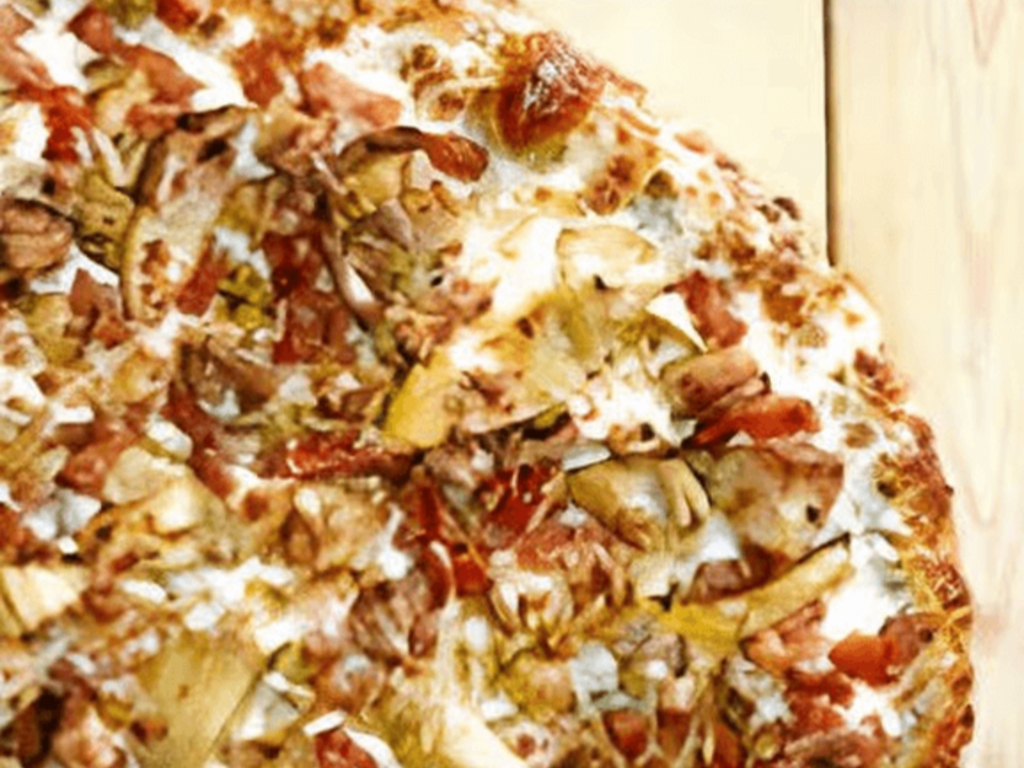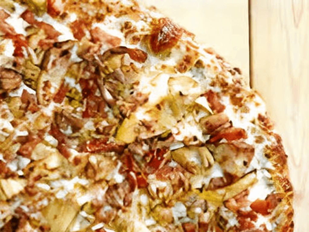 14" regular crust. White garlic sauce, diced chicken breast, crispy bacon, diced tomatoes, red onion and marinated artichoke hearts.