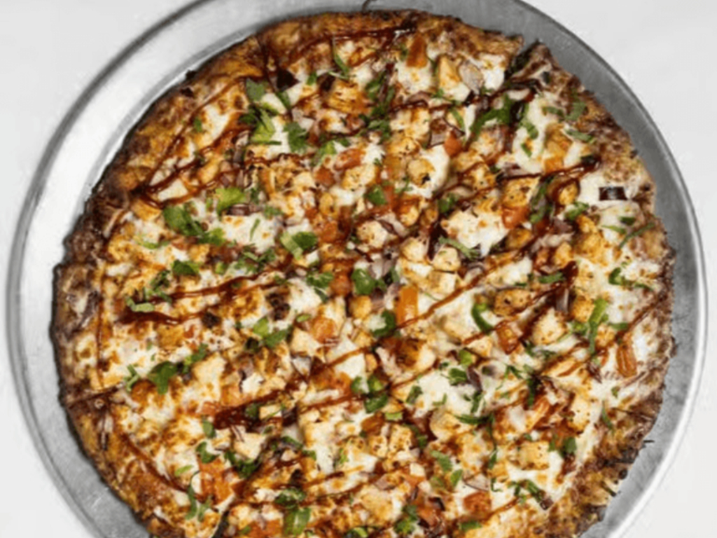 A savory, sweet, and tangy pizza featuring grilled chicken, rich BBQ sauce, mozzarella, red onions, and fresh cilantro on a crispy crust.