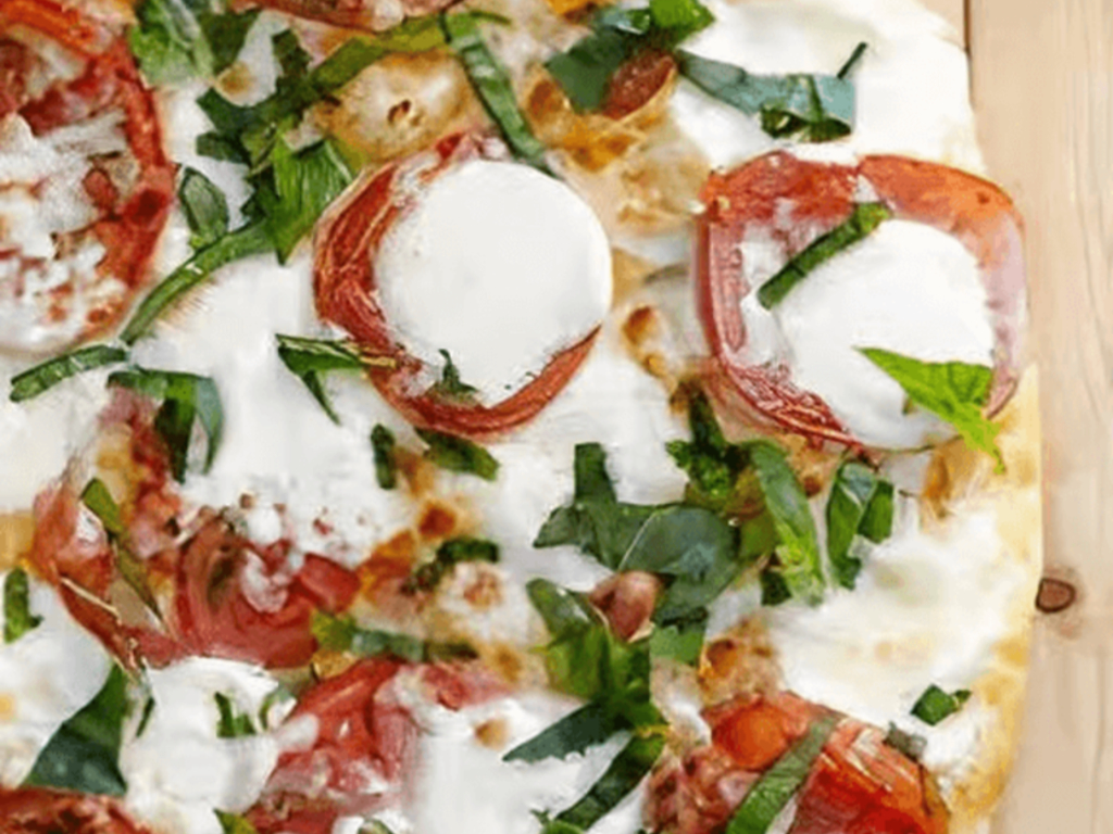 A creamy garlic sauce base topped with grilled chicken, mozzarella, tomatoes, and onions on a crispy crust.