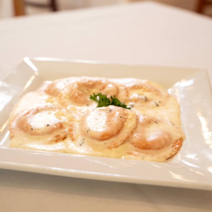 Homemade ravioli filled with butternut squash, creamy sage sauce.