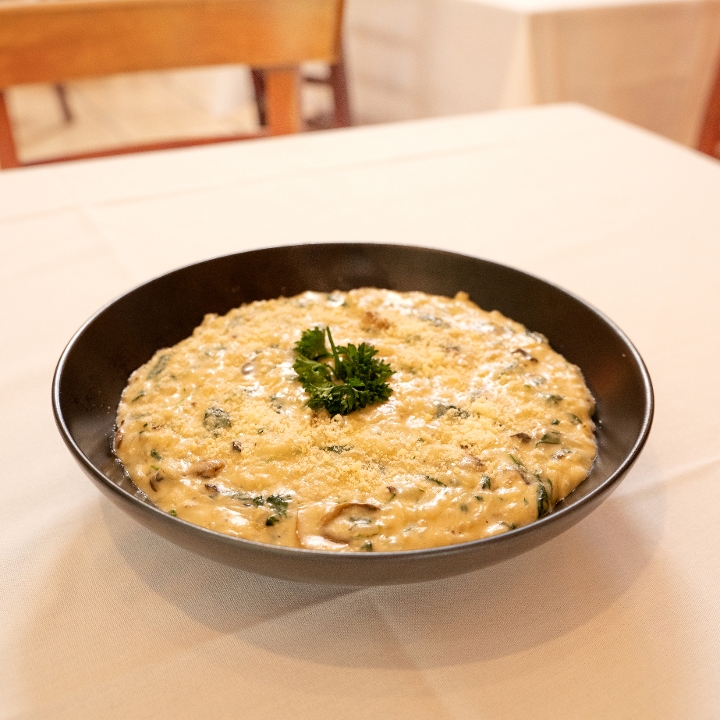 Tender Arborio rice cooked with porcini mushrooms, spinach, vegetable broth, Parmesan cheese.