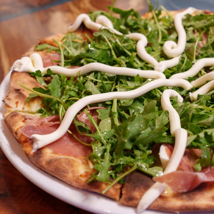 Pizza topped with fresh buffalo mozzarella, prosciutto di Parma, arugula, mascarpone cheese.