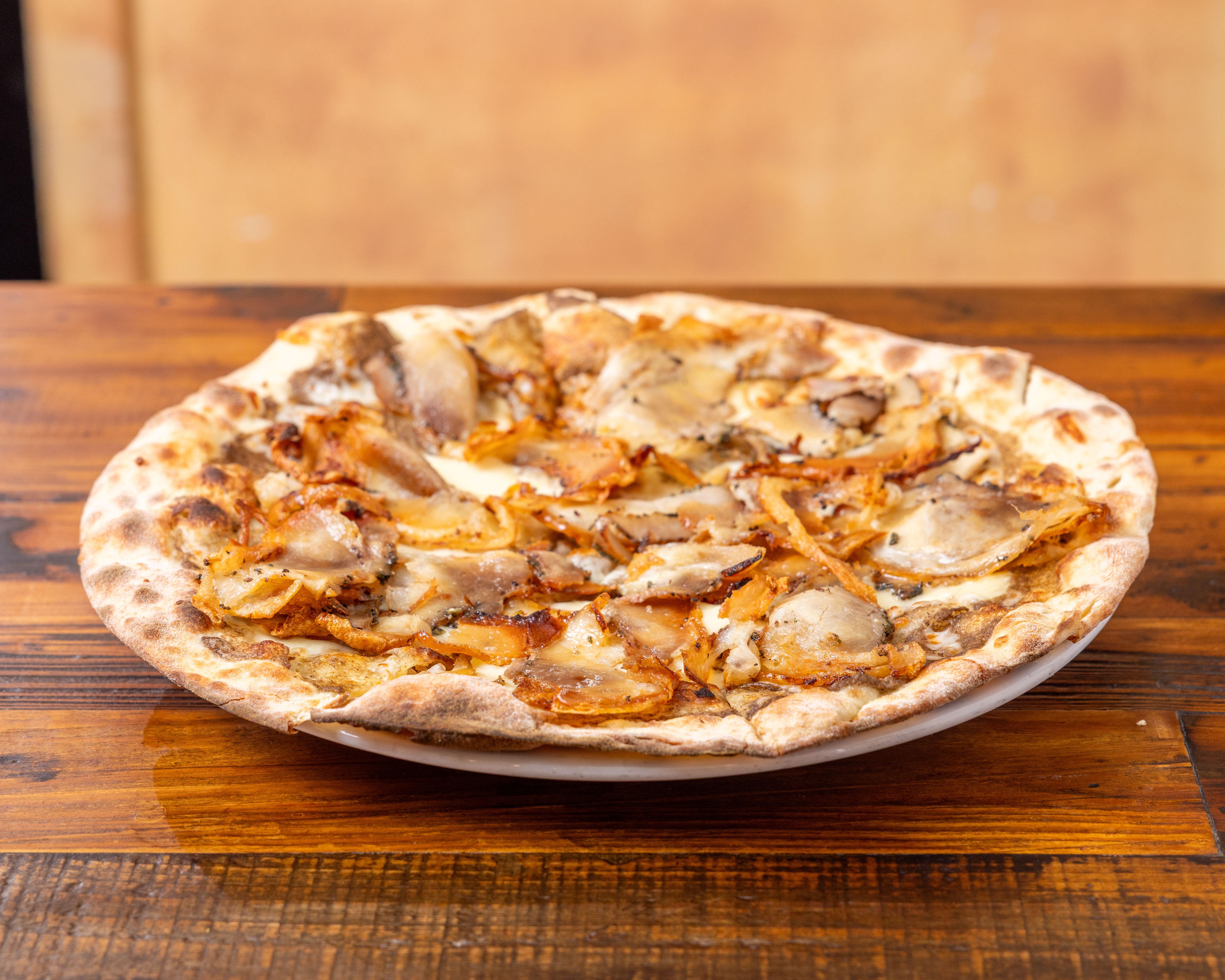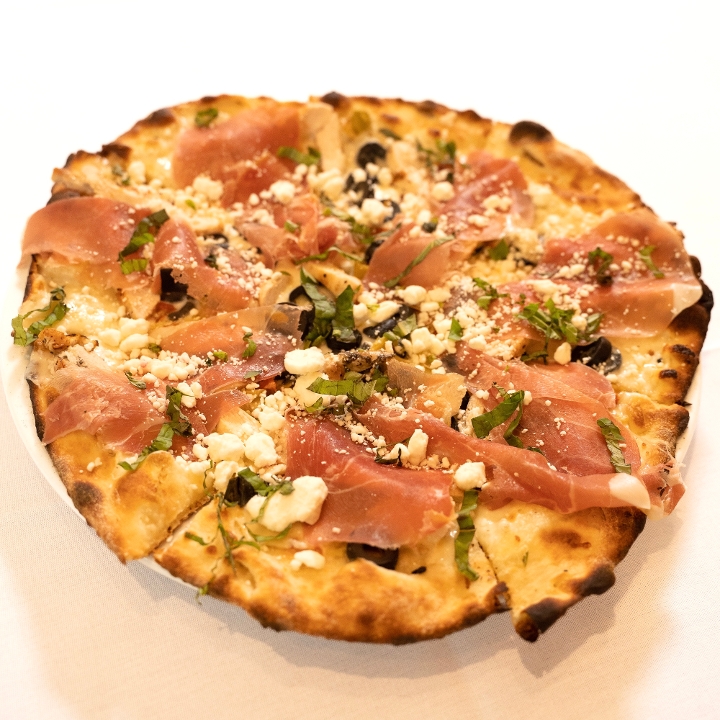Pizza topped with creamy porcini mushroom, white truffle, mozzarella cheese, prosciutto di Parma.