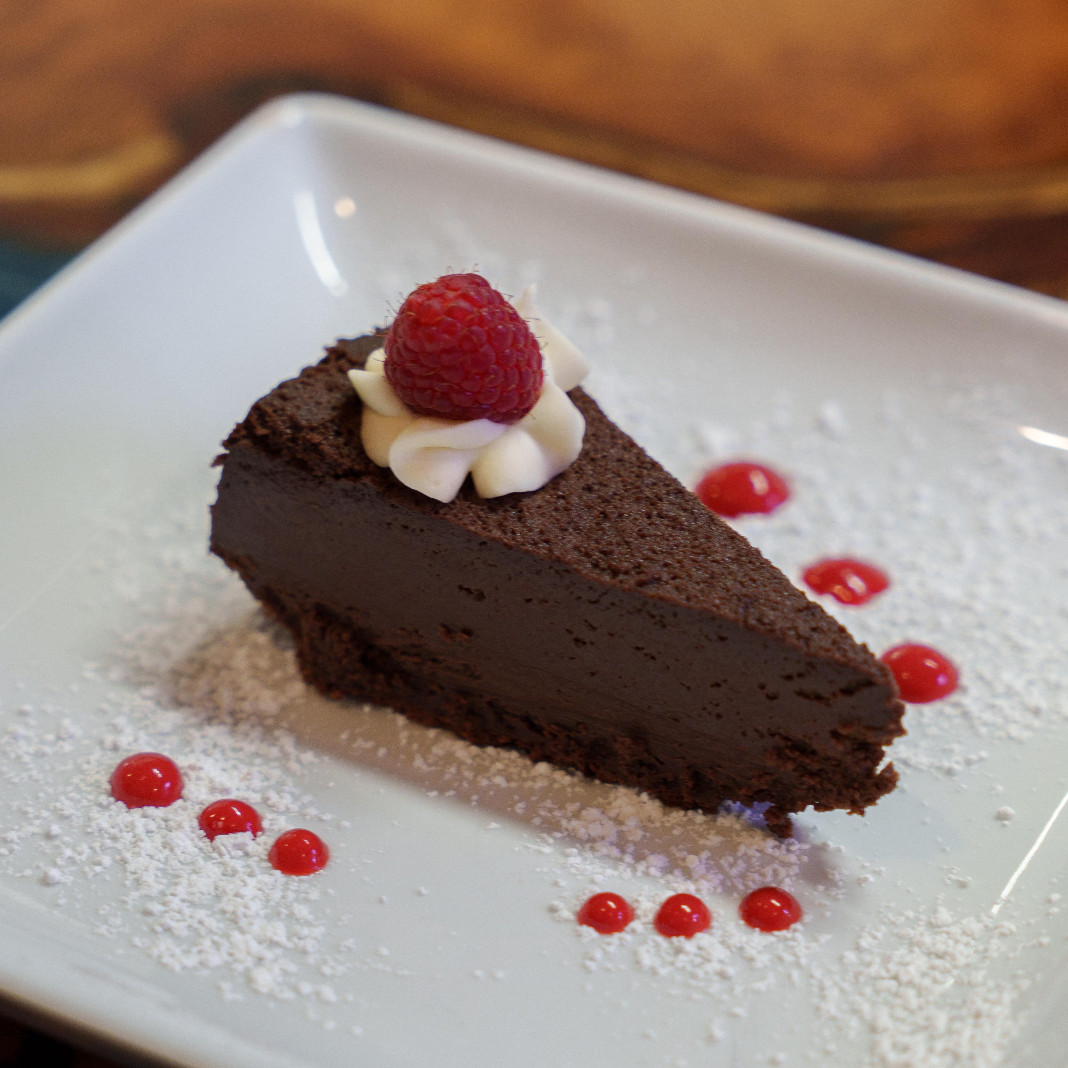 Rich flourless chocolate cake topped with raspberry, house whipped cream.