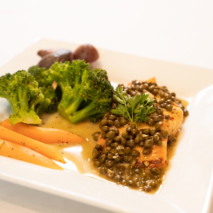 Sautéed chicken breast with artichokes, eggplant, capers, fresh tomatoes, in light demi-glace sauce.