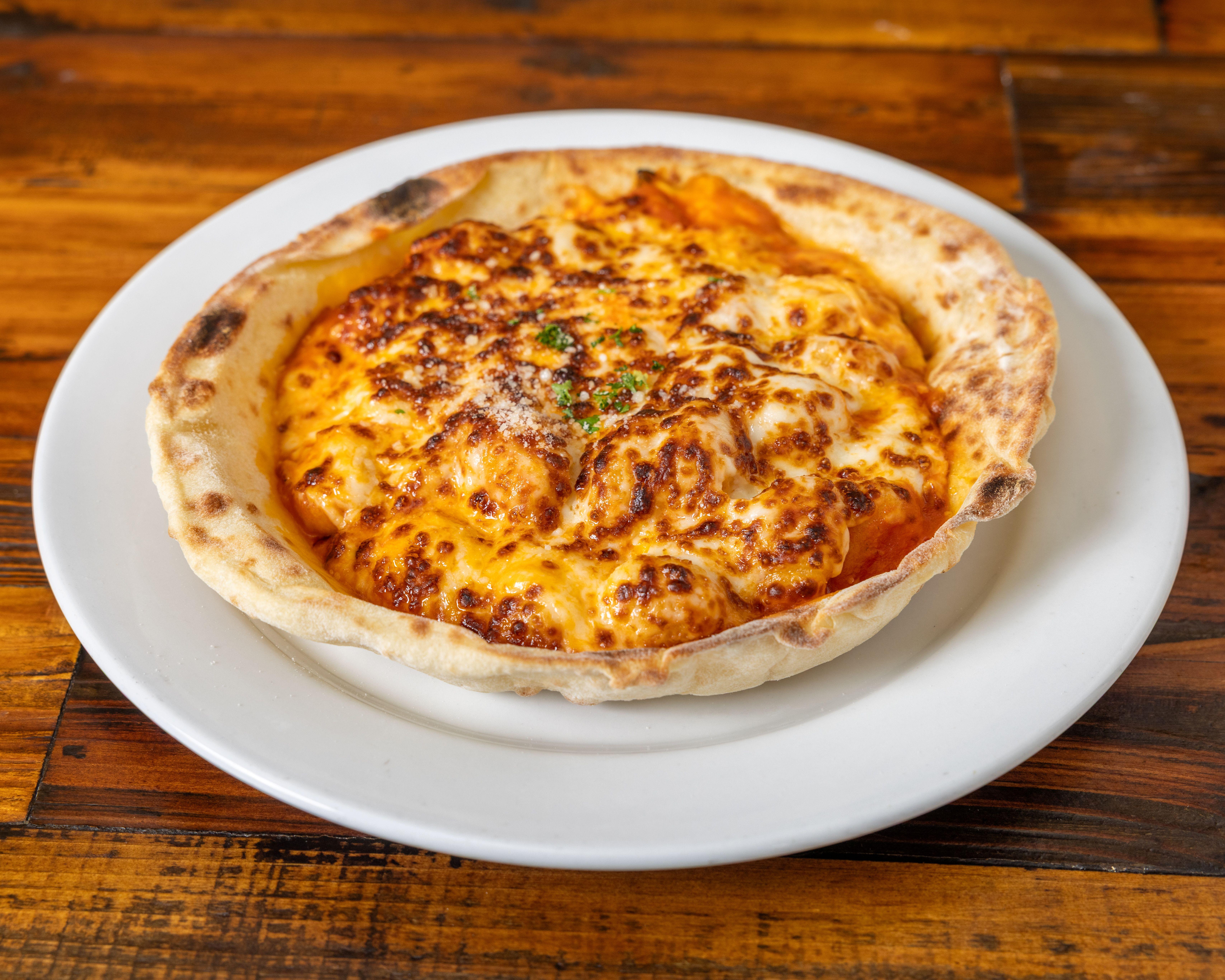 Homemade gnocchi with marinara sauce, fresh mozzarella, basil, served in a pizza crust nest.