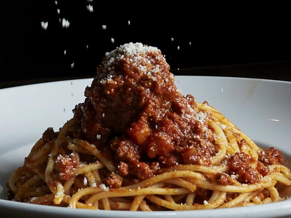 Spaghetti pasta with homemade meatballs in Bolognese sauce.