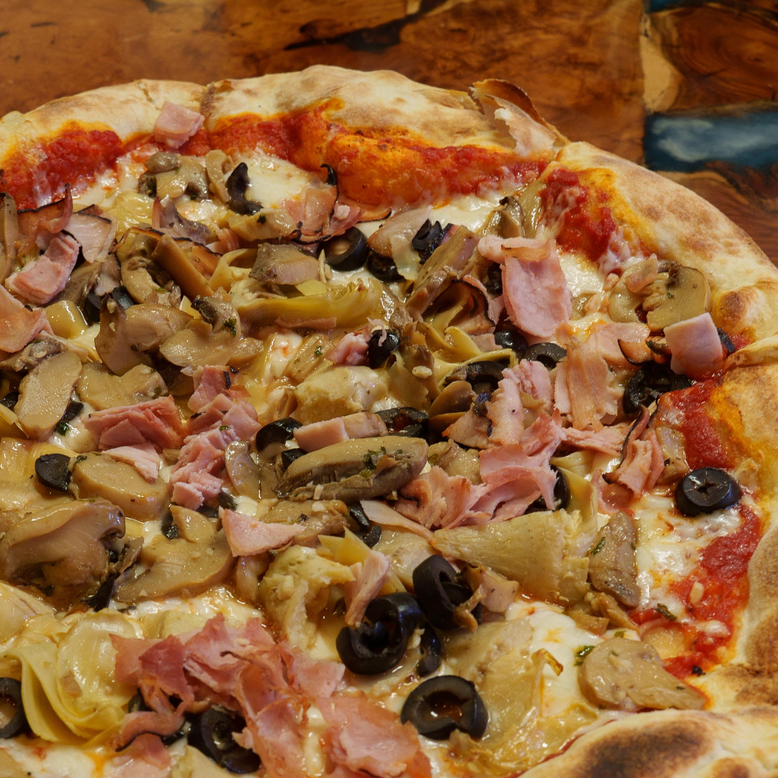 San Marzano pomodoro sauce, mushrooms, artichoke hearts, ham, black olives, mozzarella.