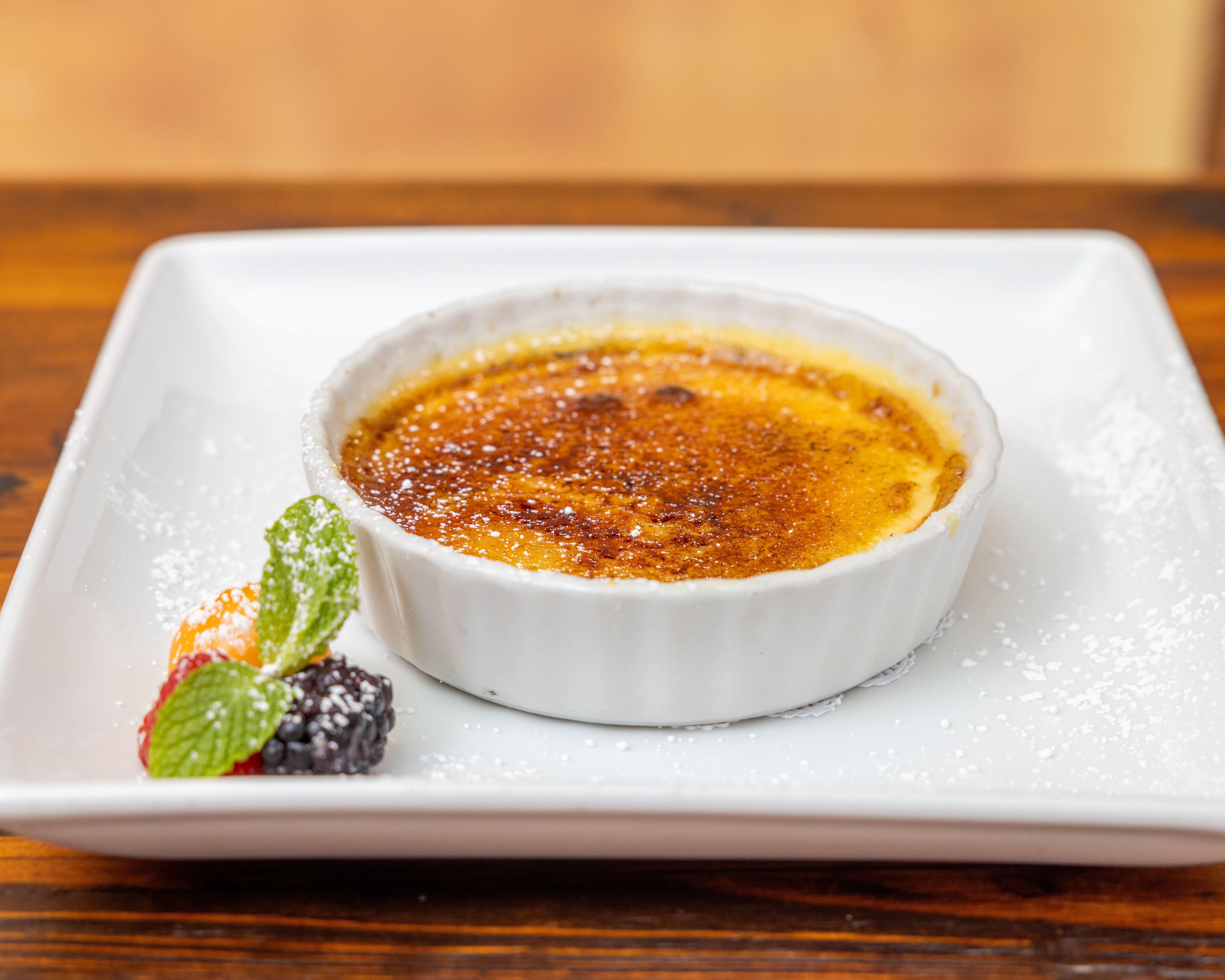 Classic crème brûlée with a thin, caramelized sugar crust.
