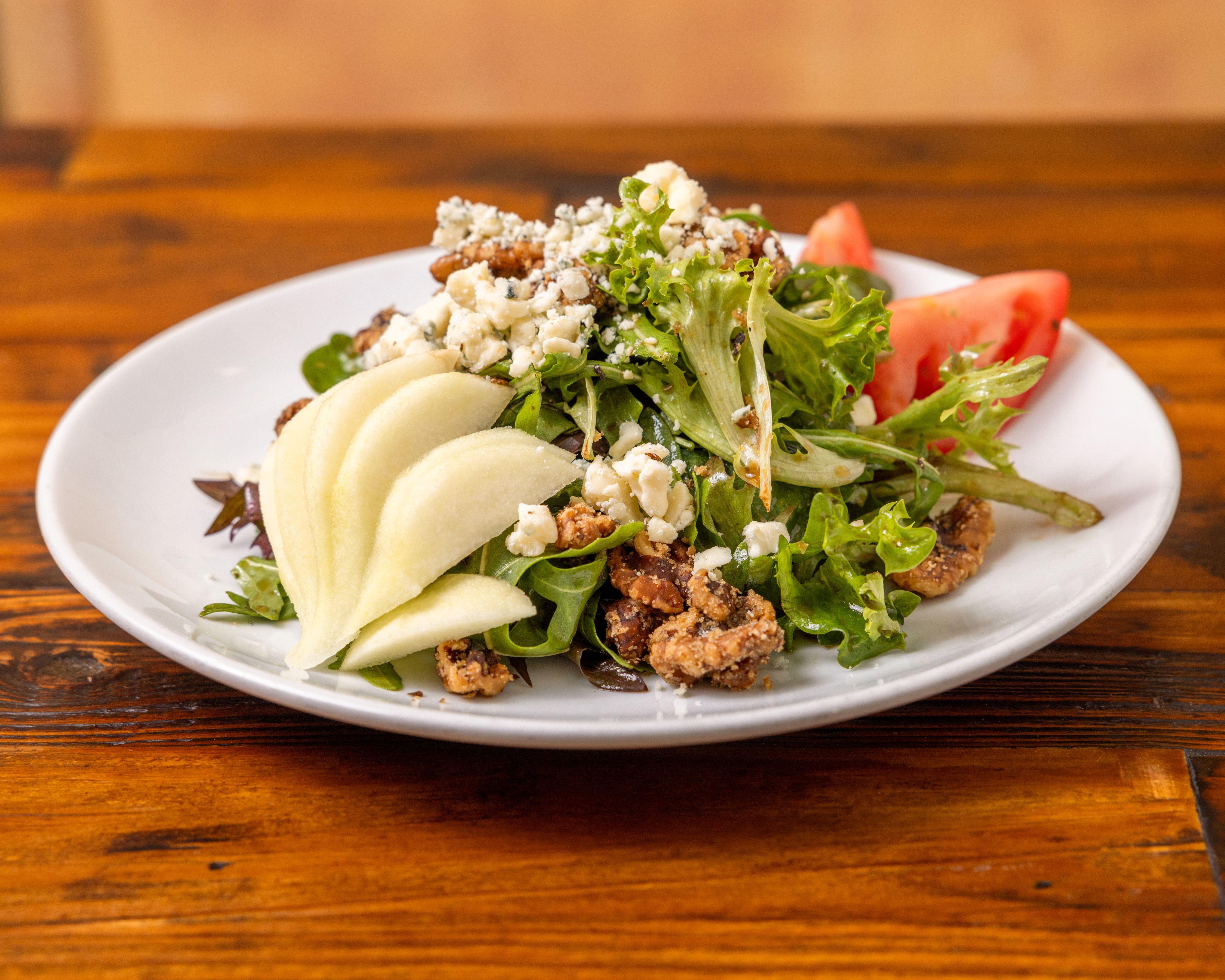Mixed greens, Roma tomatoes, pears, Gorgonzola cheese, caramelized walnuts, lime herb dressing. (GF)