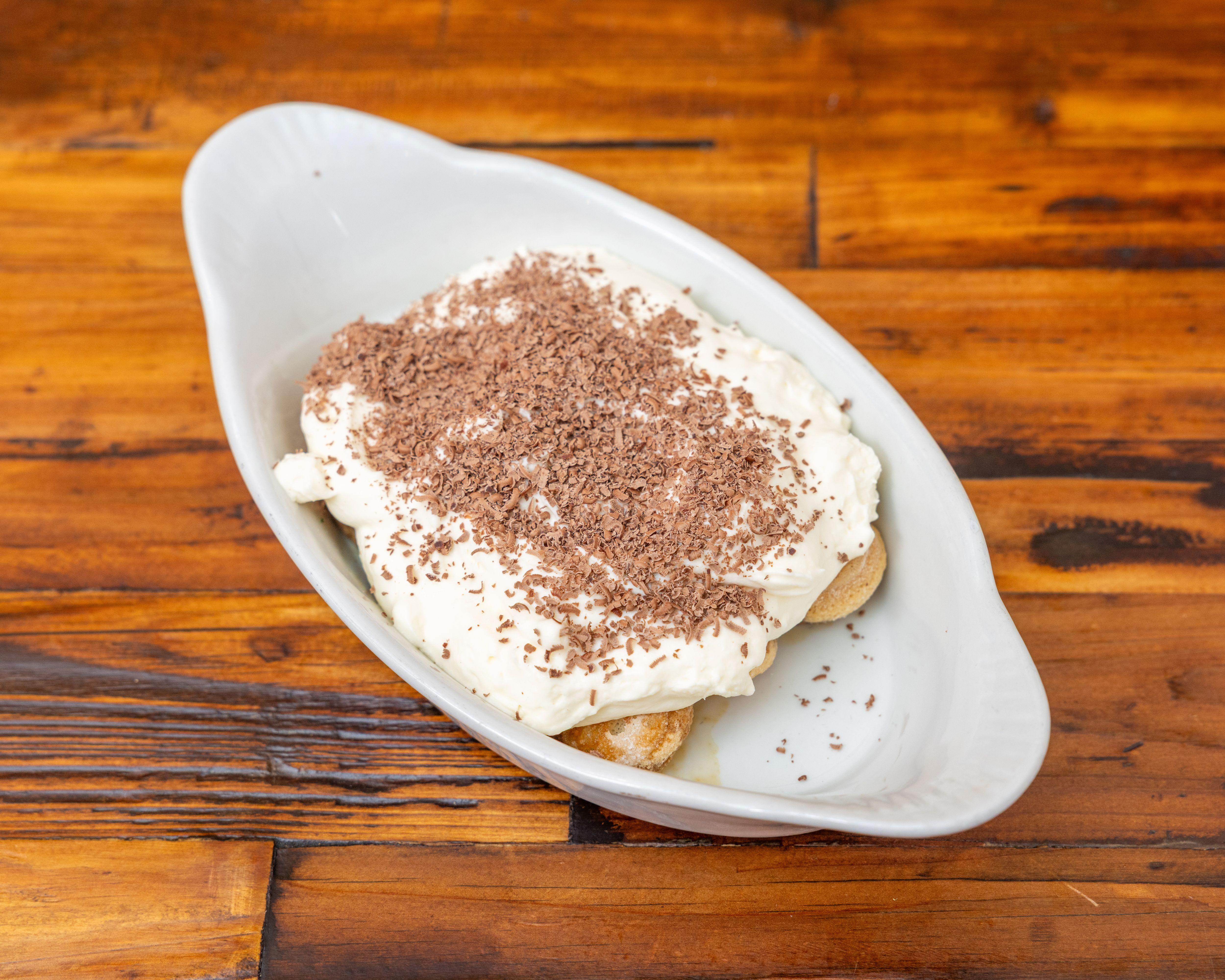 Lady fingers with espresso coffee, mascarpone cheese, topped with cocoa.