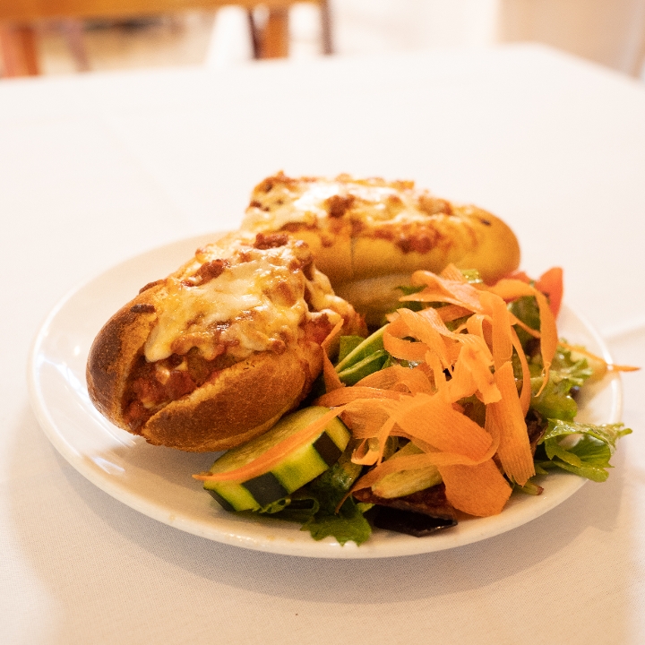 Meatballs, melted mozzarella cheese, and Bolognese sauce.