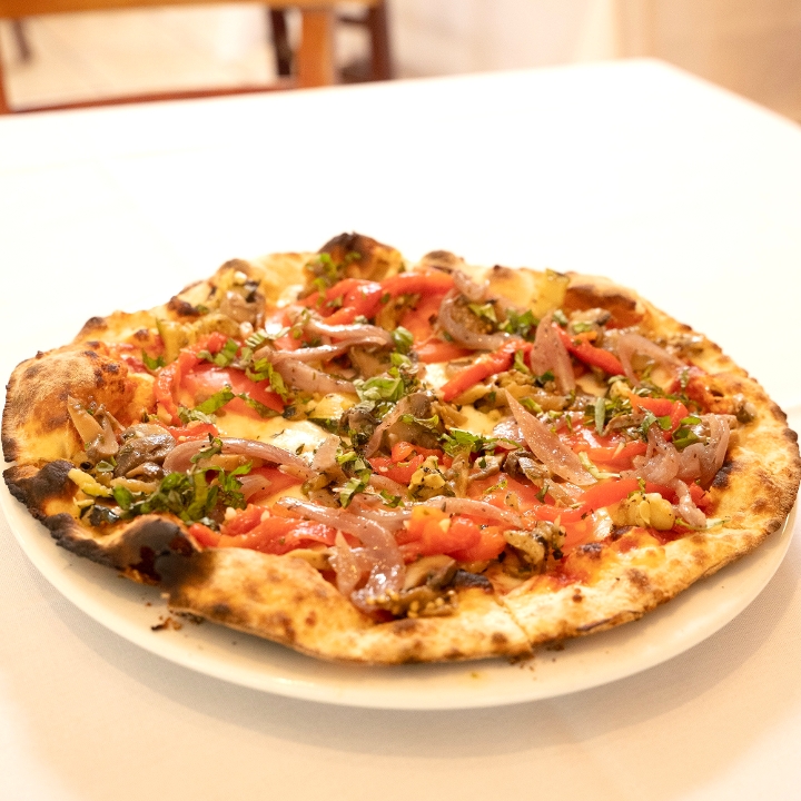 San Marzano pomodoro sauce, grilled eggplant, grilled zucchini, roasted bell peppers, roasted red onions, fresh tomatoes, sautéed mushrooms.