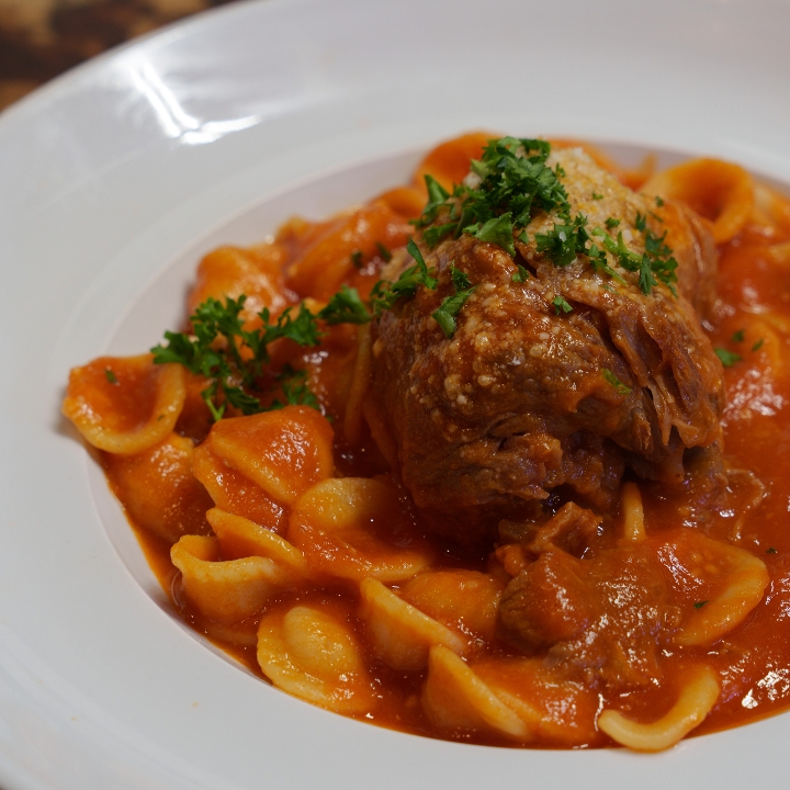 Ear-shaped pasta served with top sirloin steak, rolled, filled with spices, Parmesan cheese, Italian pancetta, fresh garlic, cooked in tomato sauce.