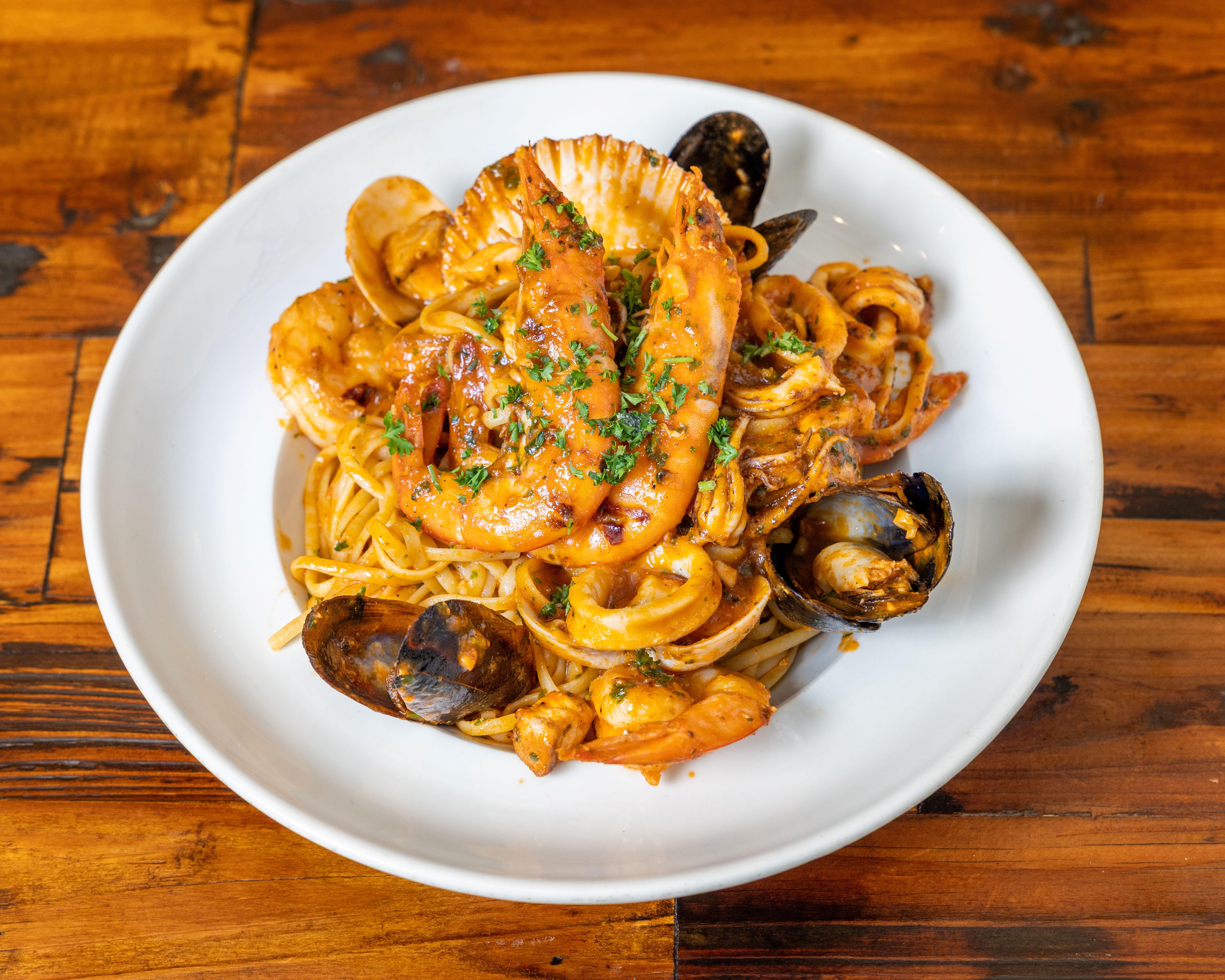 Spaghetti sautéed with fresh seafood with a white wine light cherry tomato sauce.